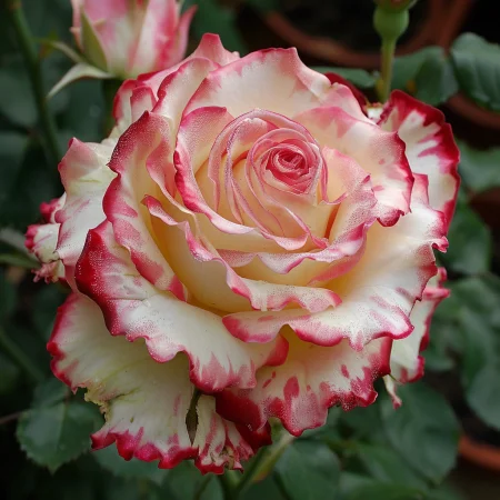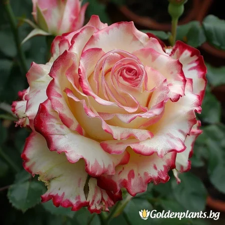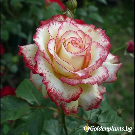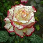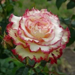 Ροζ Φλορίμπουντα με δίχρωμα άνθη: κρεμ-λευκό με κόκκινες άκρες. Μεσαία, γεμάτα άνθη (9–10 εκ.), ελαφρύ άρωμα. Ύψος περίπου 70–80 εκ., ανθίζει από Ιούνιο έως Οκτώβριο, ανθεκτική σε ασθένειες, ιδανική για ηλιόλουστους κήπους και παρτέρια.